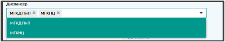 12) Диспансер. Из выпадающего списка выбираем диспансер, в который хотим направить запрос. Доступна возможность выбрать сразу два диспансера.