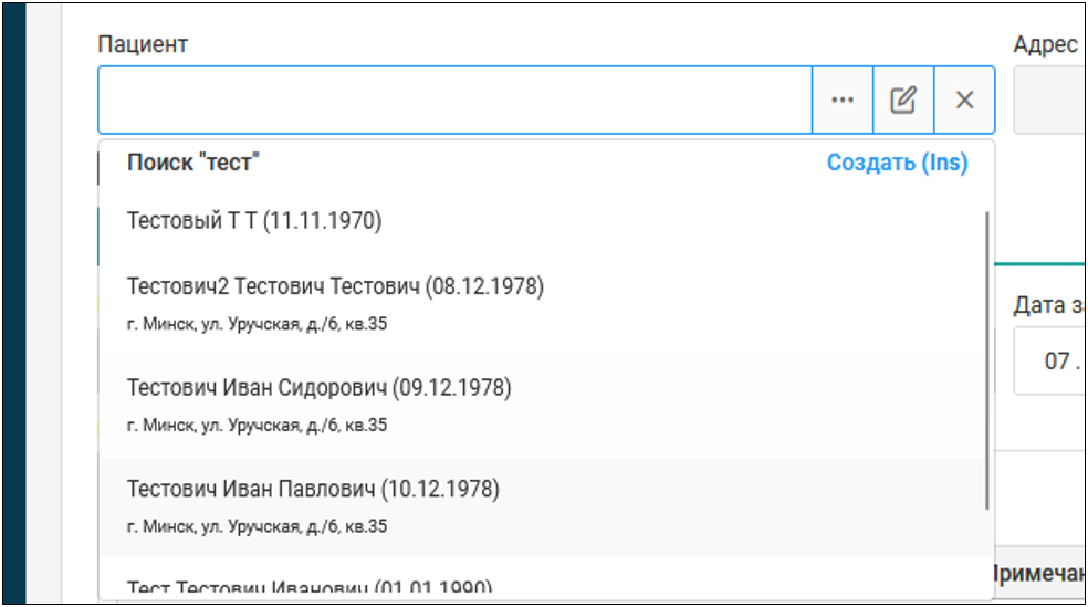!!! Если пациент уже есть в базе, то обязательно выбираем его из предложенных!!!