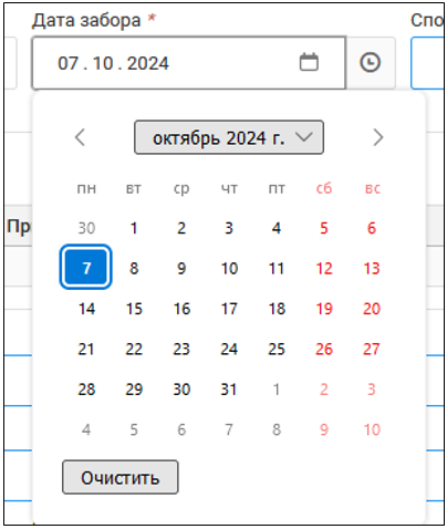 5. Дата забора – обязательное поле, где указывается дата забора материала. По умолчанию ставится текущая дата. Можно поменять на любую дату.