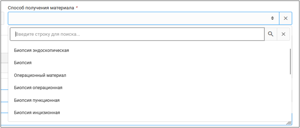 6. Способ получения материала – обязательное поле, где указывается способ из списка. Есть поиск по наличию букв.