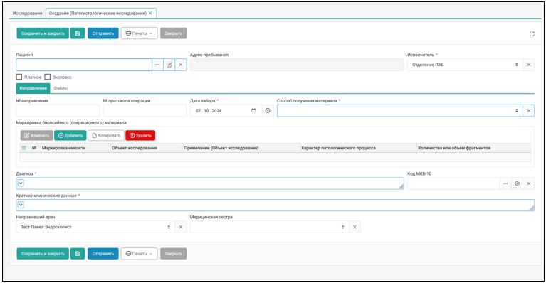 2. Исполнитель – выбираем ПАБ, в который нужно отправить исследование.