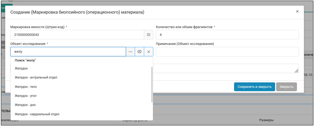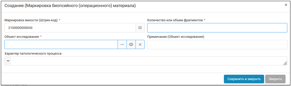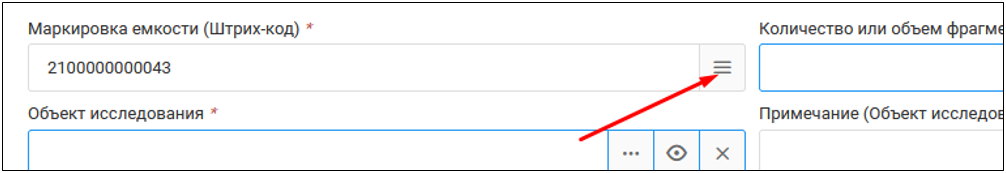 Указываем маркировку емкости (писать ничего не нужно, просто нажать кнопку в строке, указываем кол-во фрагментов и объект исследования.