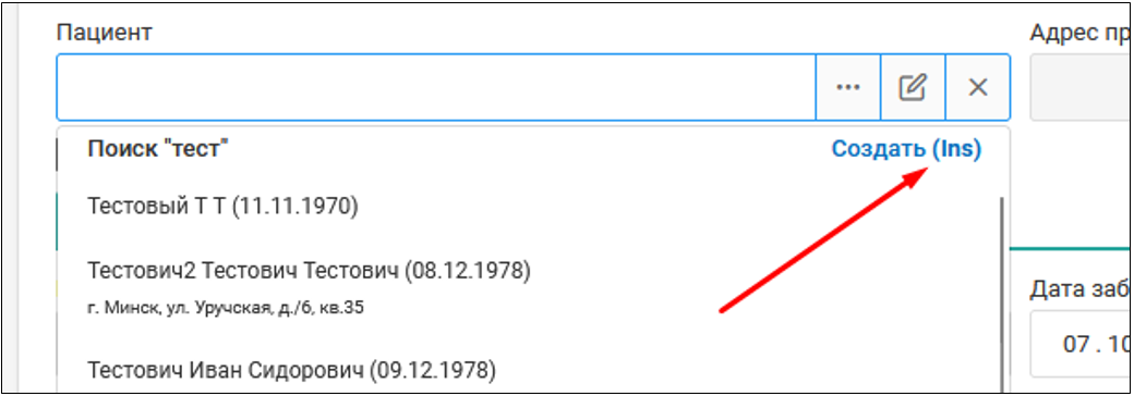 Если пациента нет в списке, то нажимаем «Создать (Ins)» или клавишу Insert.