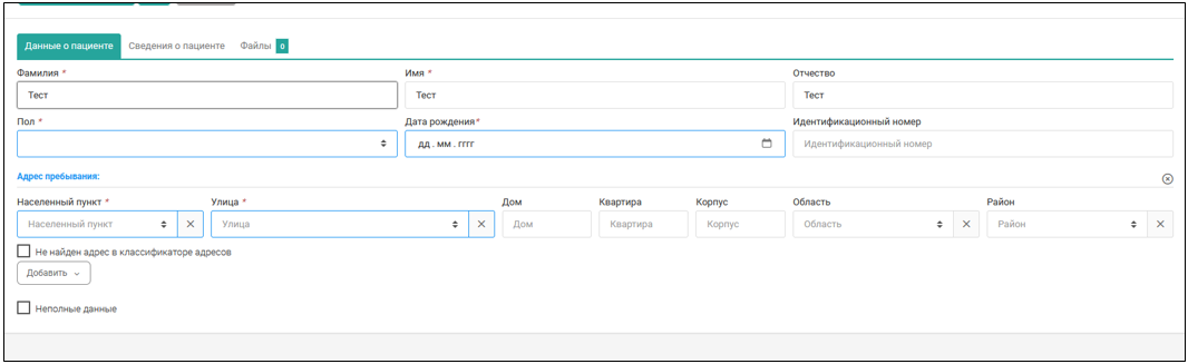 При добавлении пациента указываем его ФИО, пол, дату рождения, идентификационный номер и адрес.