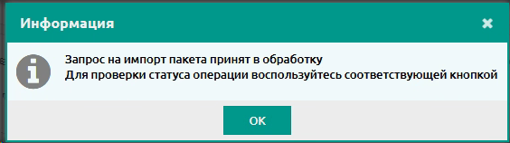 10. Получим информационное окно: "Запрос на импорт пакета принят в обработку".