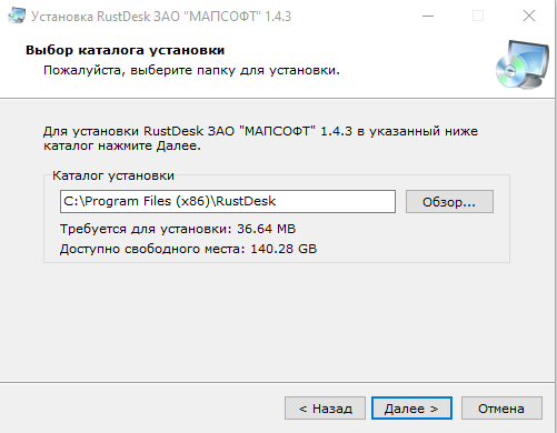 4. После успешной загрузки файла запускаем RustDesk Setup.exe, появится окно установки. Нажимаем «Далее >».