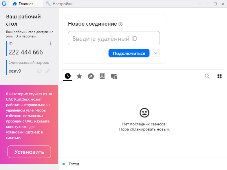 9. Если на предыдущем шаге осталась отметка «Запустить RustDesk», то после этого автоматические запустится программа. Также программу можно запустить через ярлык на рабочем столе.