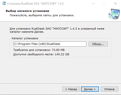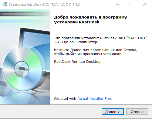 4. После успешной загрузки файла запускаем RustDesk Setup.exe, появится окно установки. Нажимаем «Далее >».