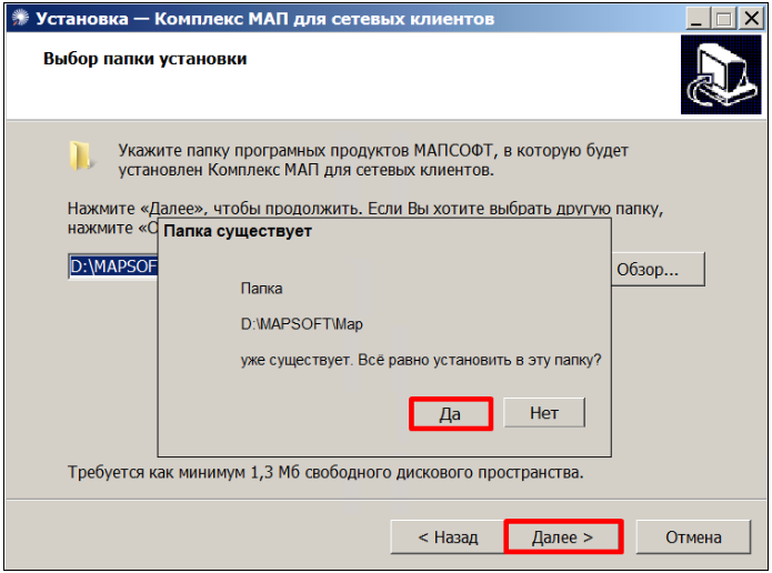 5. Если программа была ранее установлена на компьютере, появляется сообщение Папка D:\MAPSOFT\Map уже существует. Все равно установить эту папку?